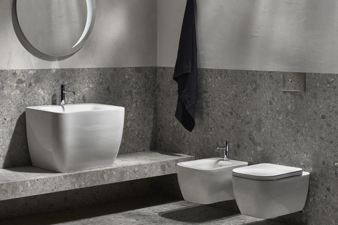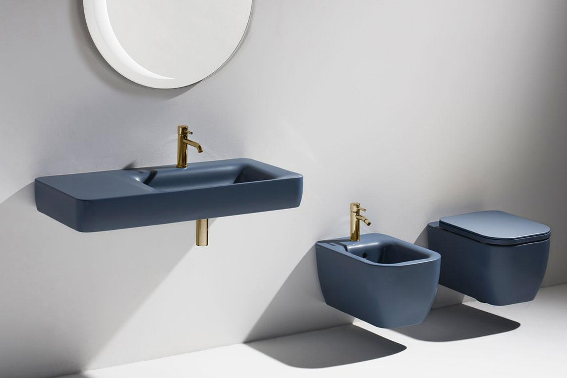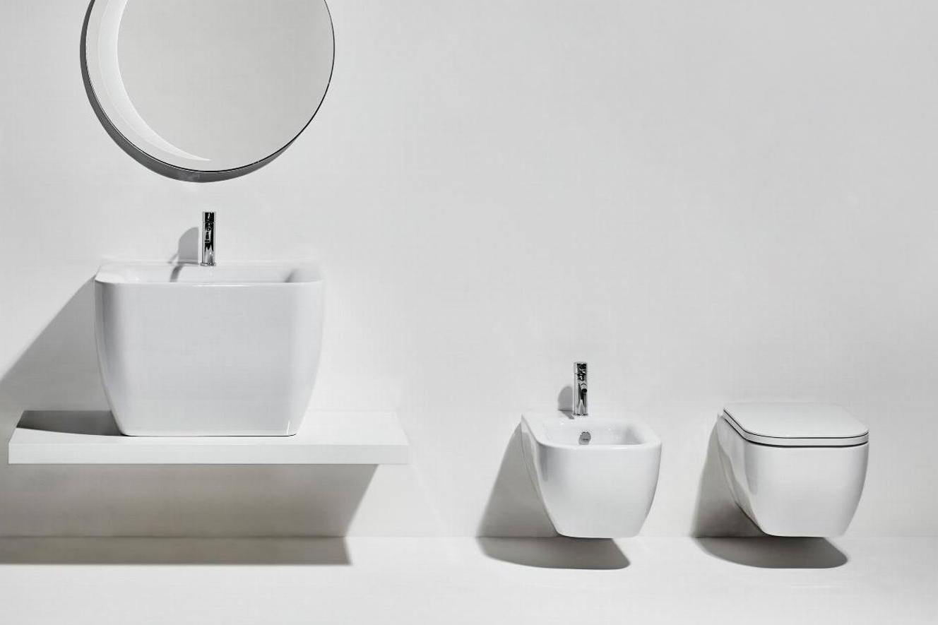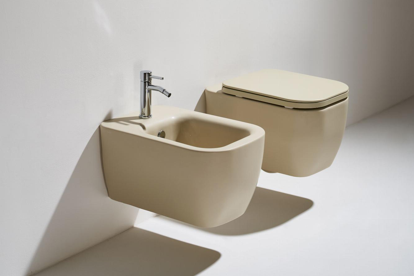 Конзолна тоалетна чиния Henges с „Rimless“ технология. Комплект с монтажен комплект F85 и със седалка и капак с плавно затваряне HE 004.