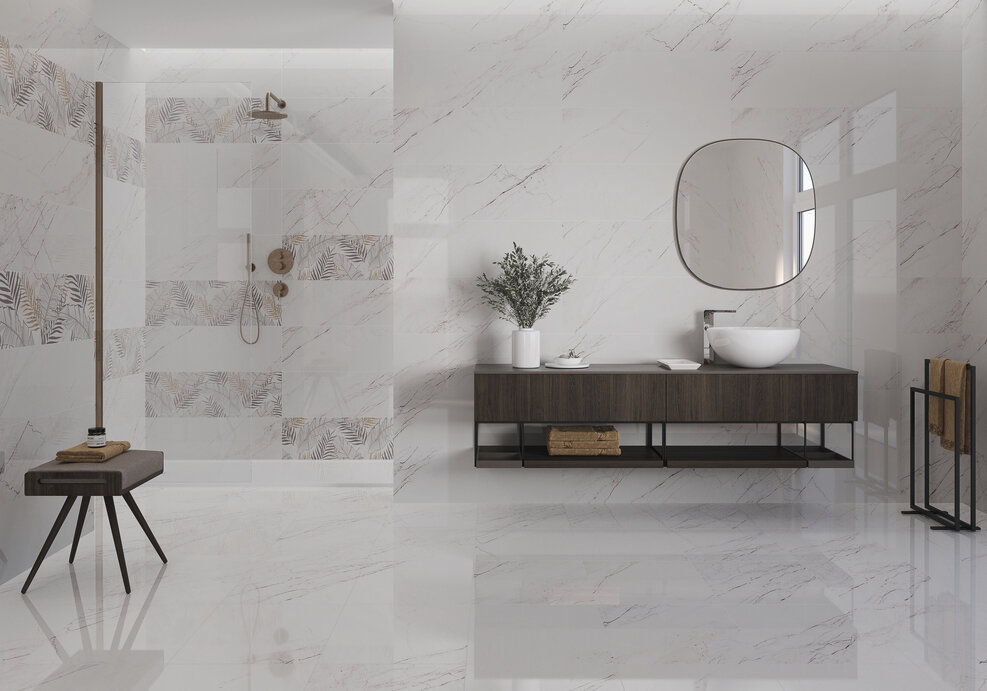 Мрамор съчетан с красива рисунка и текстура на декора. Природни елементи, внасящи една различна и ненатрапчива свежест в серии „Amposta“ от EL MOLINO