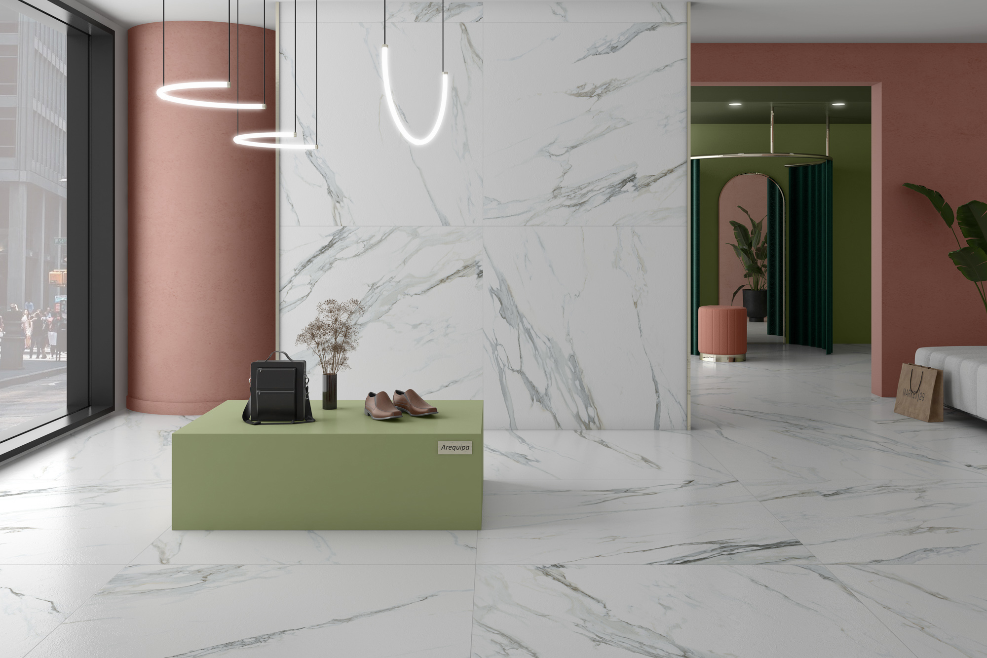 Гранитогрес Arequipa пресъздава мрамор Borghini, този вид на мрамора може да се намери в