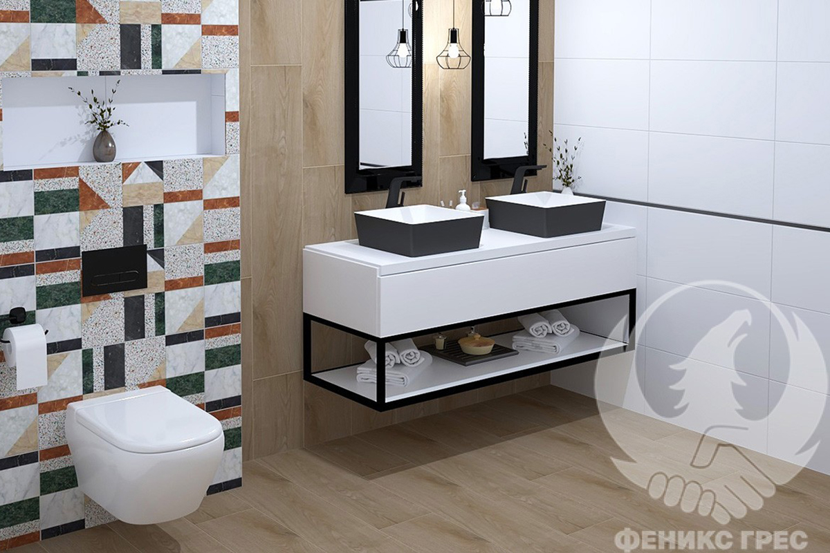 Към успокояващите класически бял мат плочки и дърво добавихме цветната геометрия на декоративната мозайка, за да направим модерен прочит на ретро стила в новите бани Ferrara.