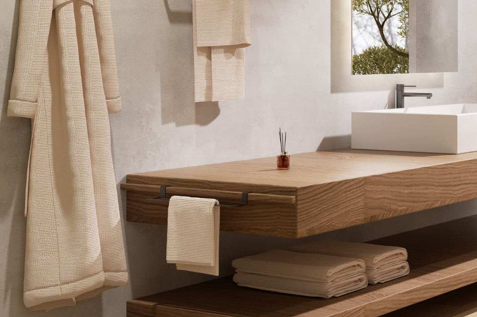 Авангарден интериорен хавлийник за мебели серия Form, който се откроява с прави линии и прецизна геометрия, внасяйки модерна и функционална естетика в банята.