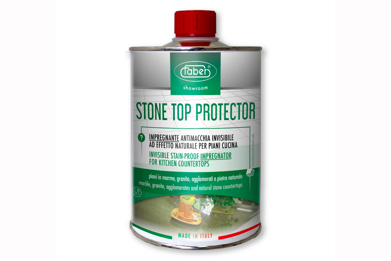 STONE TOP PROTECTOR е импрегнационна обработка на основата на разтворител, устойчива на петна, за защита на плотове в кухнята и банята, маси или работни плотове, изработени от естествен или регенериран камък, от вода и петна. Той е сертифициран като безопасен за употреба върху повърхности, които са в контакт с храна. Продуктът предотвратява проникването на петна в материала, което улеснява ежедневната поддръжка.