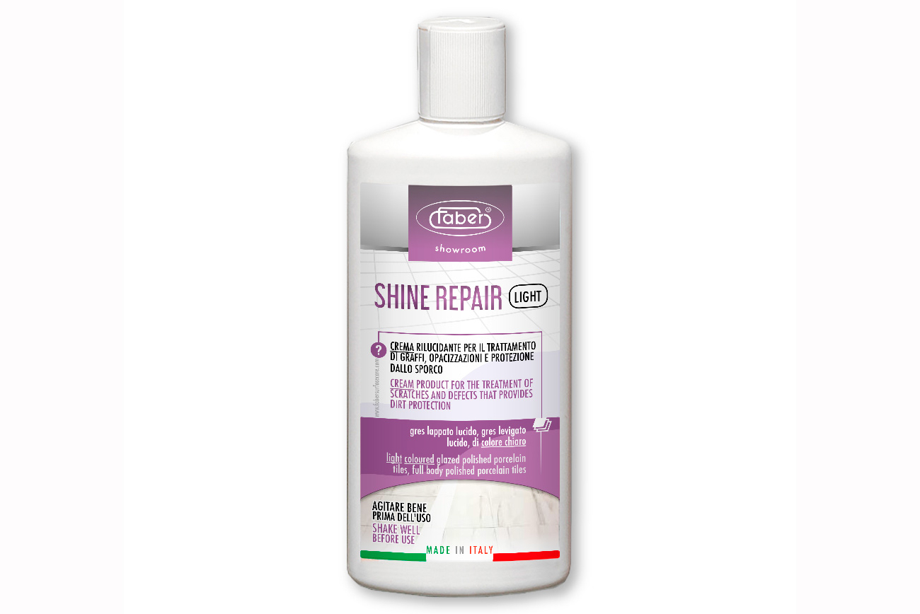 SHINE REPAIR LIGHT е кремообразен продукт на водна основа, предназначен за употреба върху светли полирани и гланцирани порцеланови керамични плочки, за да се минимизират драскотините и дефектите.