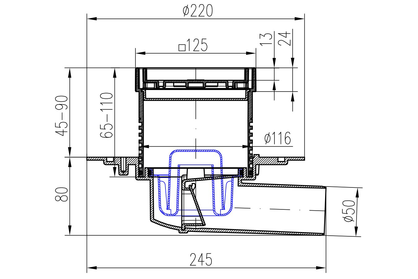 Сифонът е предназначен за вътрешна и външна употреба. Включва сух клапан и воден затвор. Изработен от полипропилен, полистирол и неръждаема стомана. Товароносимост K3-300 кг, устойчивост до 90°C.